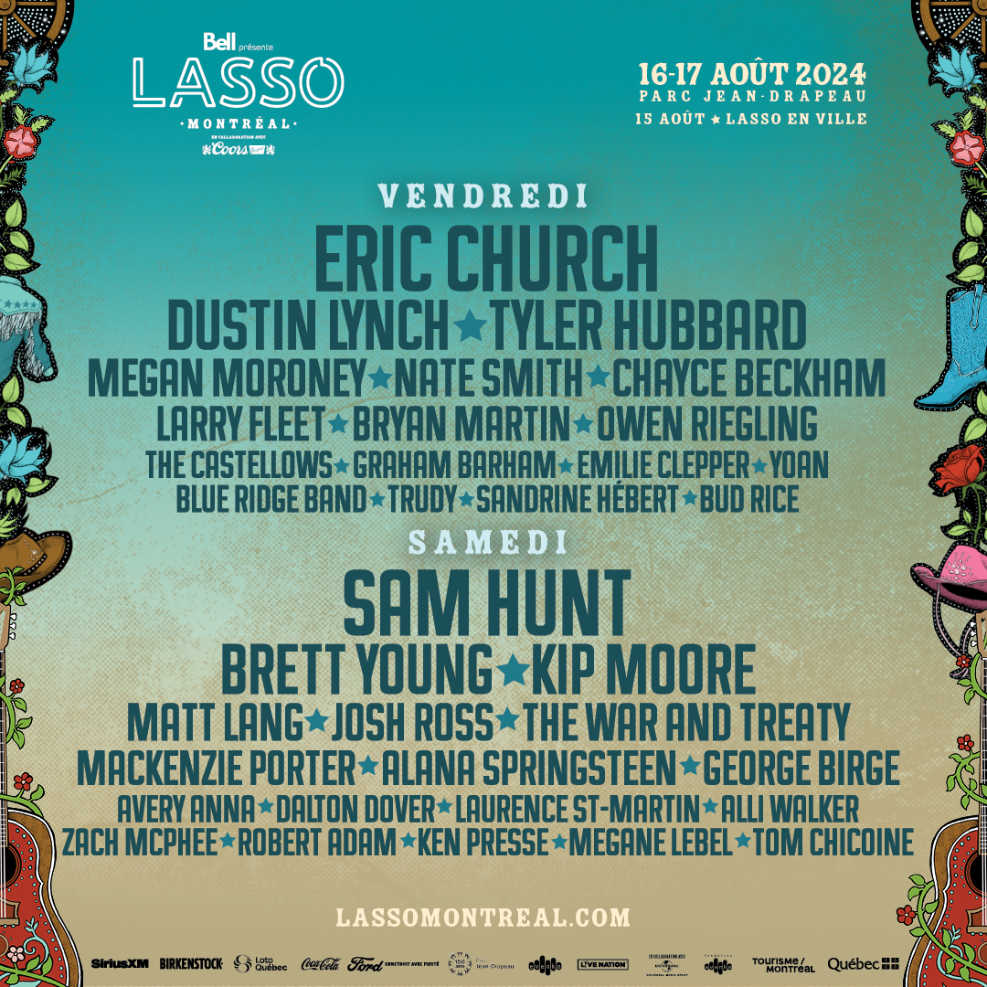 LASSO ERIC CHURCH DUSTIN LYNCH TYLER HUBBARD MEGAN MORONEY NATE SMITH CHAYCE BECKHAM LARRY FLEET BRYAN MARTIN OWEN RIEGLING THE CASTELLOWS GRAHAM BARHAM ÉMILIE CLEPPER YOAN BLUE RIDGE BAND TRUDY SANDRINE HÉBERT BUD RICE SAM HUNT BRETT YOUNG KIP MOORE MATT LANG JOSH ROSS THE WAR AND TREATY MACKENZIE PORTER ALANA SPRINGSTEEN GEORGE BIRGE AVERY ANNA DALTON DOVER LAURENCE ST-MARTIN ALLI WALKER ZACH MCPHEE ROBERT ADAM KEN PRESSE MÉGANE LEBEL TOM CHICOINE