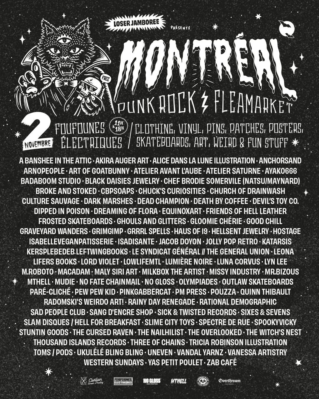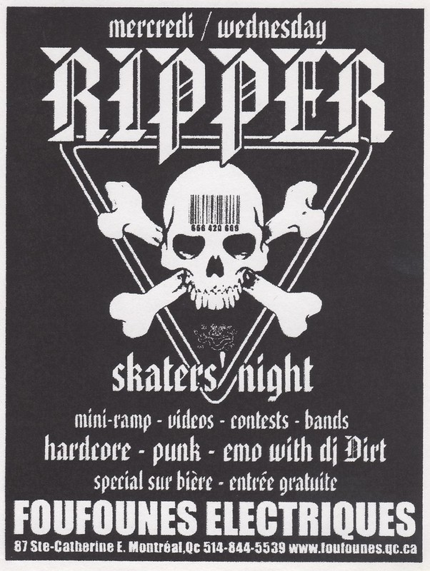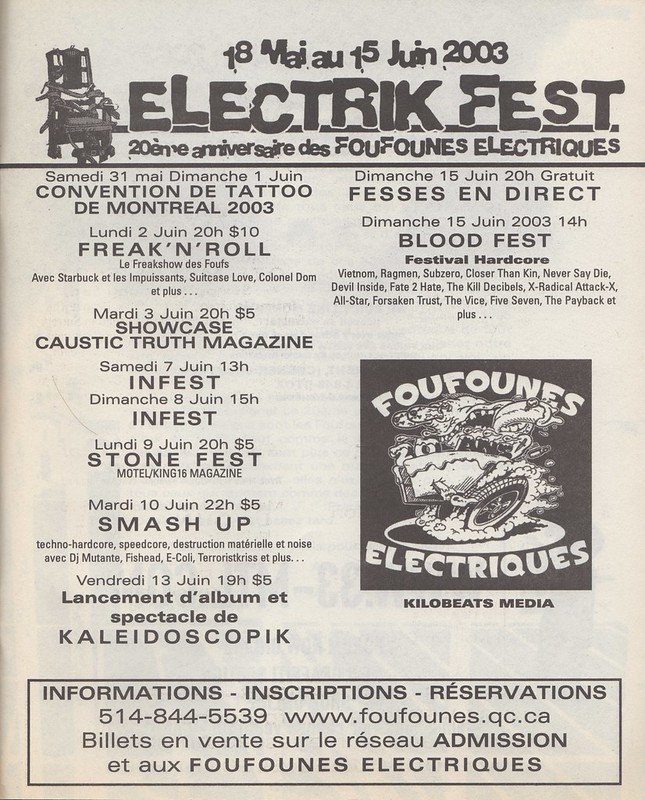 Les Foufounes Électriques est un bar situé sur la rue Sainte-Catherine à Montréal, largement reconnu comme le temple de l’underground montréalais. Connu sous le nom de « Foufs » par les locaux, le club est la plus ancienne salle de rock alternatif de la ville. D’abord un lieu d’expression de la culture punk, il s’y est développé une tradition de « peinture en direct » où des artistes réalisent une œuvre sous forme de performance. Avec le temps, « Les Foufs » sont devenues une véritable institution de la culture underground québécoise, au point d’être comparées au célèbre CBGB, de New-York.7