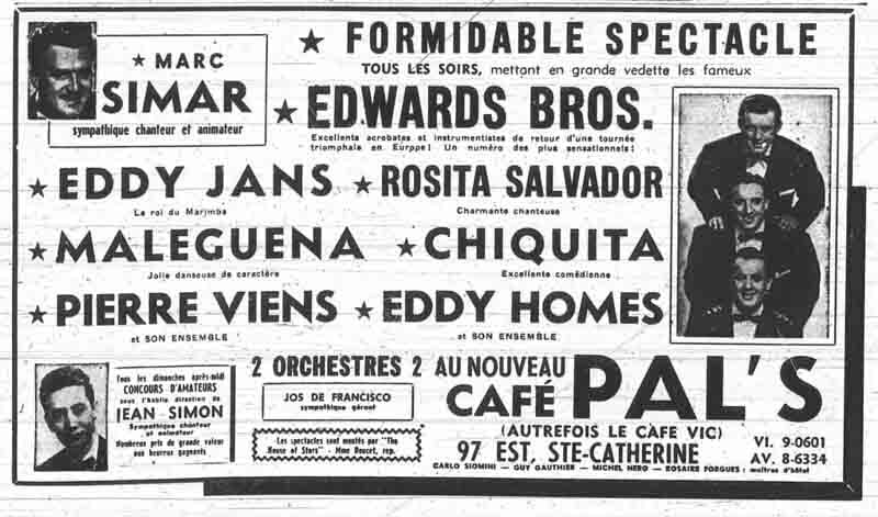 En 1955, le Café Vic change d’administration et lance un concours pour trouver un nouveau nom, avant d’être vendu et rebaptisé Café Pal en 1957. Les clubs de nuit et cabarets montréalais, souvent liés à la famille Cotroni, avaient du mal à respecter les règlements municipaux, notamment sur les heures de fermeture. Des figures comme Vic et Frank Cotroni entretenaient des relations étroites avec les artistes, les protégeant dans un monde où la mafia contrôlait la plupart des établissements nocturnes de Montréal.