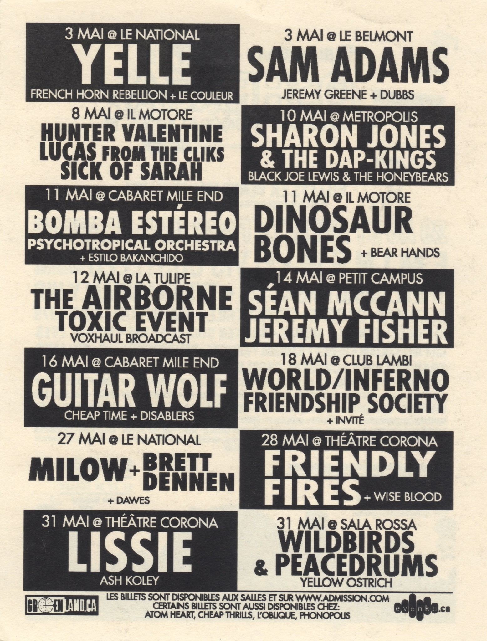 YELLE SAM ADAMS HUNTER VALENTINE LUCAS FROM THE CLIKS SICK OF SARAH SHARON JONES & THE DAP-KINGS BLACK JOE LEWIS & THE HONEYBEARS BOMBA ESTÉREO PSYCHOTROPICAL ORCHESTRA DINOSAUR BONES BEAR HANDS THE AIRBORNE TOXIC EVENT VOXHAUL BROADCAST SÉAN MCCANN JEREMY FISHER GUITAR WOLF CHEAP TIME DISABLERS WORLD/INFERNO FRIENDSHIP SOCIETY MILOW BRETT DENNEN DAWES FRIENDLY FIRES WISE BLOOD LISSIE ASH KOLEY WILDBIRDS & PEACEDRUMS YELLOW OSTRICH